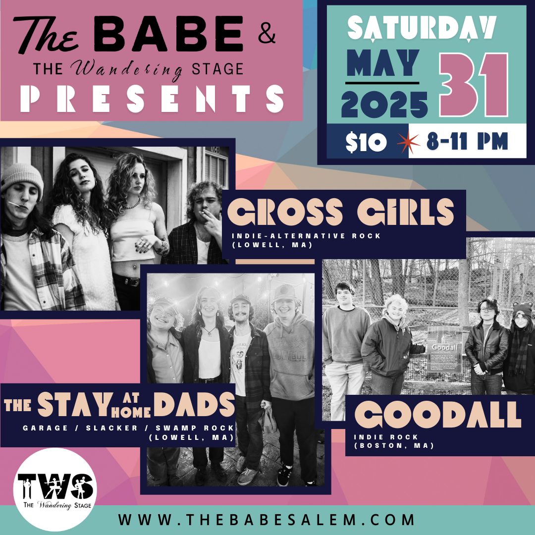 Join us Saturday, May 31st for our fourth production of ‘THE BABE PRESENTS’ music series featuring Gross Girls (Indie • Alternative Rock – Lowell, MA), The Stay At Home Dads (Garage • Swamp • Slacker Rock – Lowell, MA) and Goodall (Indie Rock – Boston, MA)! We’ve partnered with The Wandering Stage for pro staging, sound and lighting and are excited to bring an eclectic mix of local and regional artists to Salem!!! This will be an indoor show at The Babe.