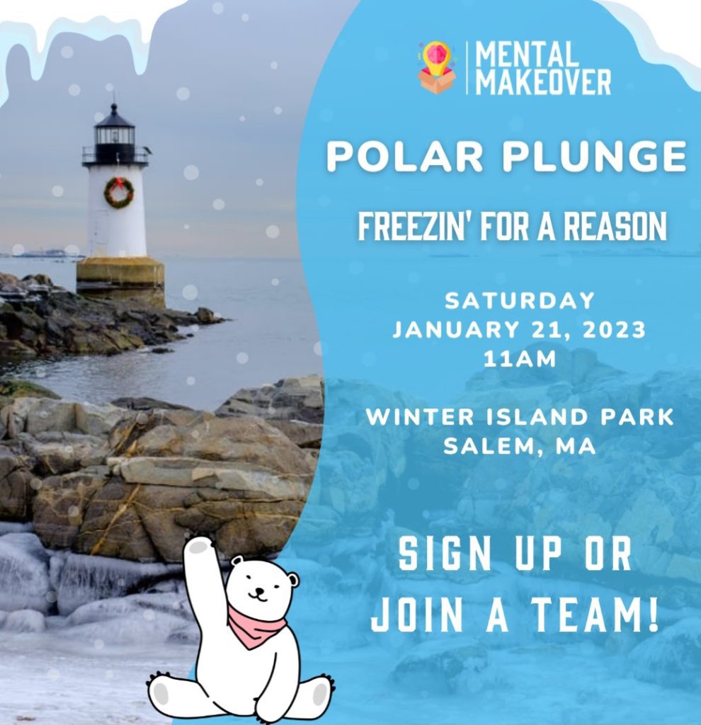 Jump into the frigid waters of Winter Island with Mental Makeover on Saturday, January 21st and warm up indoors after with music, raffles, games, and delicious hot cocoa, coffee, and food from local sponsors! The Polar Plunge will take place on the boat ramp and the gathering after will be in the function hall right next to the boat ramp in front of the hangar. People do not have to sign up to attend.