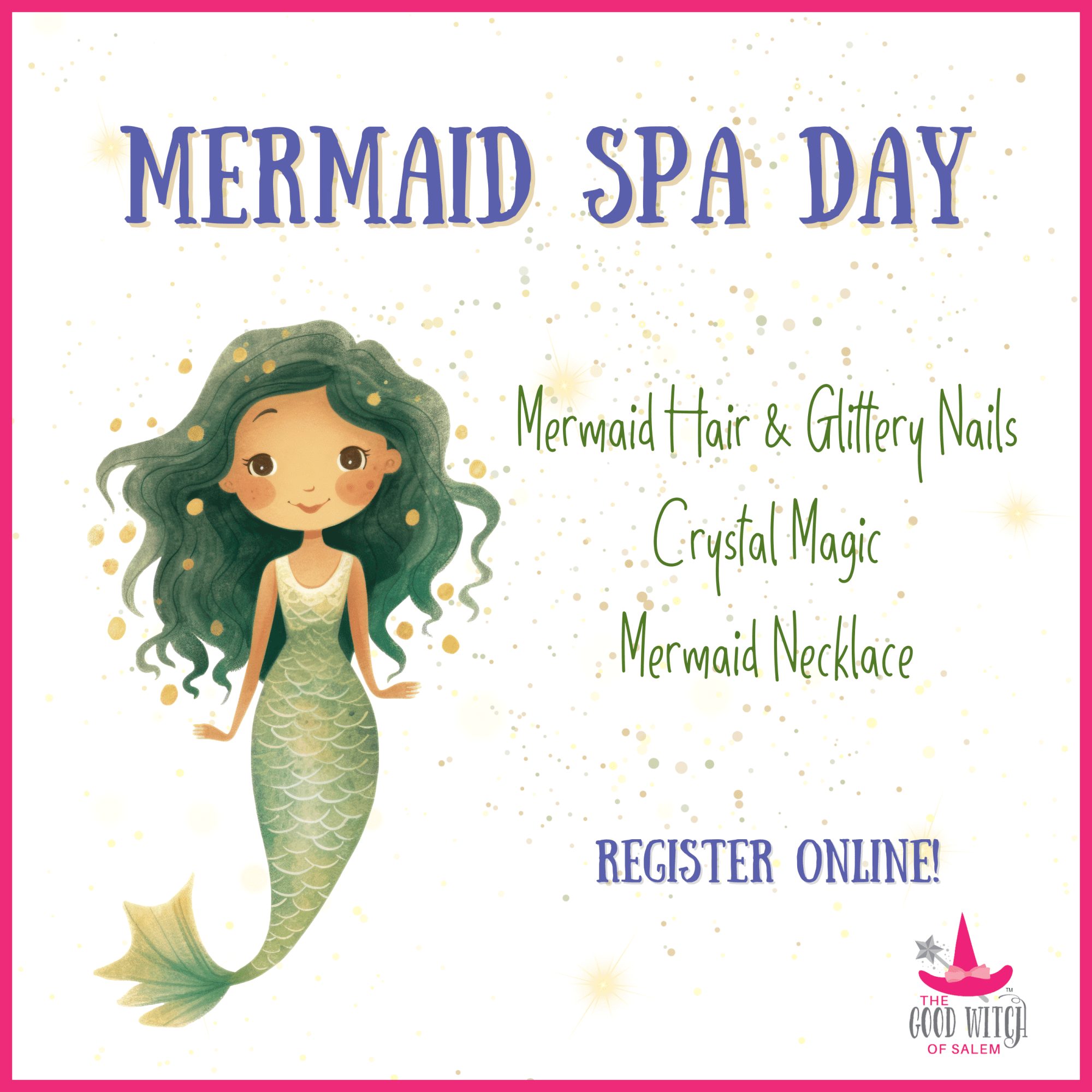 Let’s have a Mermaid Spa Day! Join us for a little pampering and relaxation with our Witch Apprentices. Children will create their own mermaid potion and receive sparkly nails, mermaid hair accessories, and a touch of glitter with pink lips and rosy cheeks.