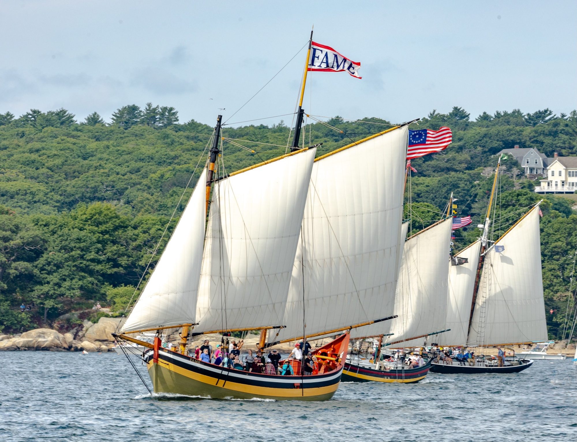 The Gloucester Schooner Festival celebrates the contribution of the fishing schooner to the history of New England. Up to 30 schooners of all shapes and sizes from all over the East Coast will be there! On Sunday of Labor Day weekend, the schooners form up for a Parade of Sail and then head out to race. We depart from Salem at 8 AM, sail to Gloucester, jump into the Parade of Sail, and then sail out with the competing schooners before returning to Salem around 1:30. The most photogenic event of the season!