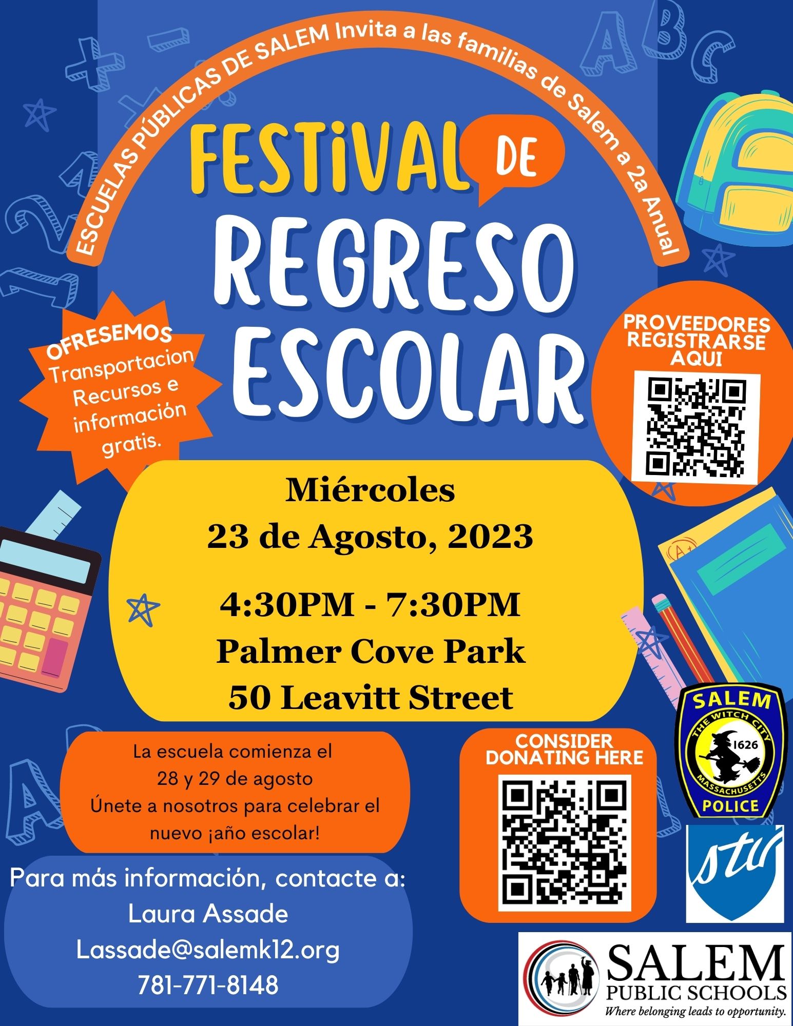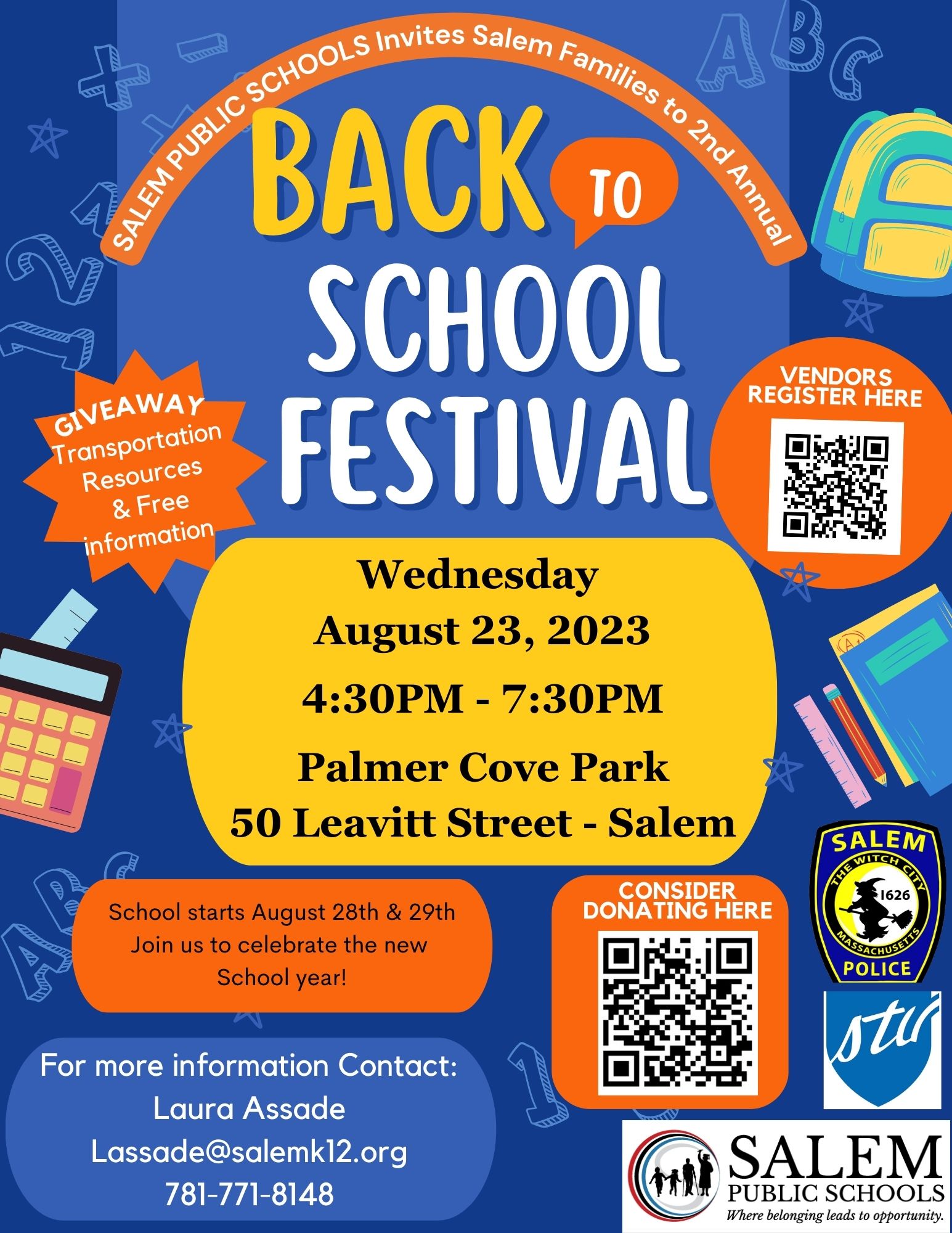 Salem Public Schools invites families to the second annual Back to School Festival on Wednesday, August 23rd at Palmer Cove Park (50 Leavitt Street) from 4:30pm – 7:30pm! While students may not return to school until August 28th and 29th, Dr. Zrike, The Salem Teachers Union and all the staff at Salem Public Schools have been working hard this summer preparing to receive students back with open arms, and are looking forward to connecting families and students with members of the community.
