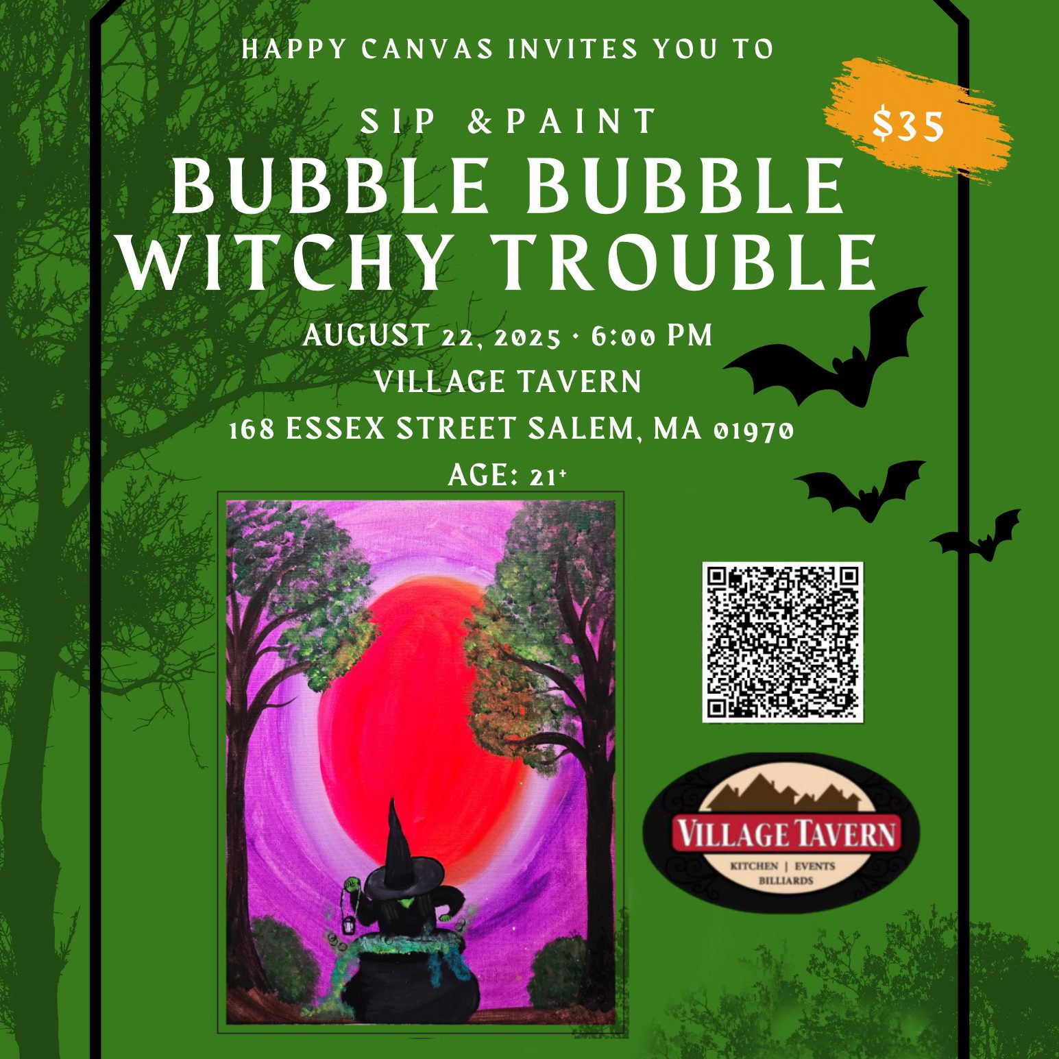 Sip, laugh, and get a little witchy with us! Join us for Bubble Bubble Witchy Trouble at Village Tavern | Bar & Grill on August 22, 2025, at 6:00 PM (ET) — a fun-filled evening where creativity meets great company. Whether you’re catching up with friends or meeting new faces, enjoy drinks, light bites, and lots of laughs while painting a magical masterpiece. It’s the perfect night out — no broomsticks or experience needed.