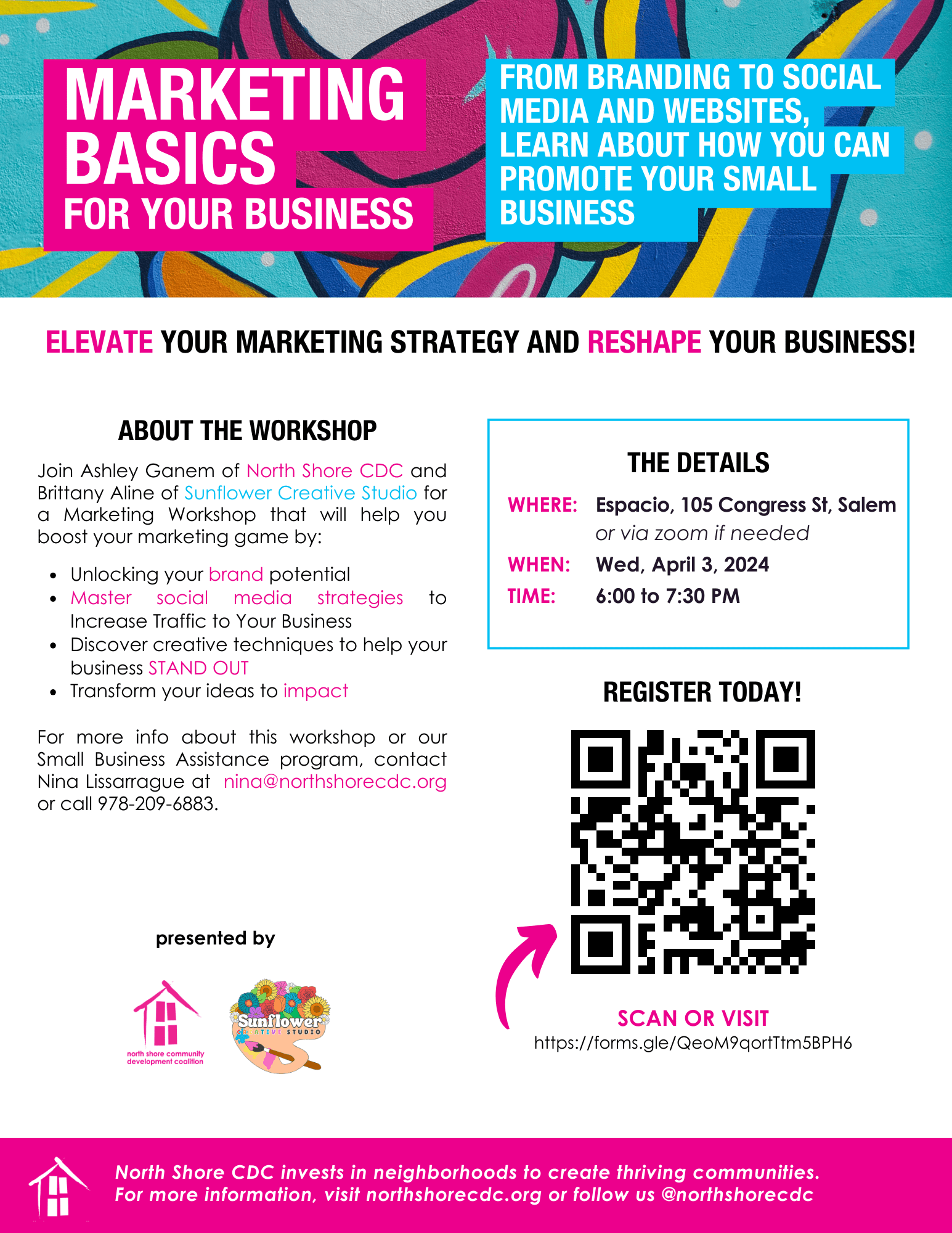 Join us on Wednesday, April 3rd from 6:00 to 7:30 PM at Espacio, 105 Congress Street in Salem, for a Marketing 101 workshop for small businesses and entrepreneurs. Learn about branding, social media, free resources, and other digital tools to bring market your business to the right audience. Please come prepared to participate. This workshop is in English. Dinner will be provided to in-person attendees.