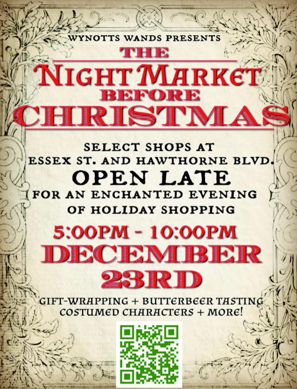 Join Wynott’s Wands for the The Night Market Before Christmas on December 23rd from 5pm to 10pm. There will be a selection of shops open on Essex Street and Hawthorne Boulevard for your last minute holiday shopping needs. Enjoy gift wrapping services, butter beer tastings, costumed characters, and more!