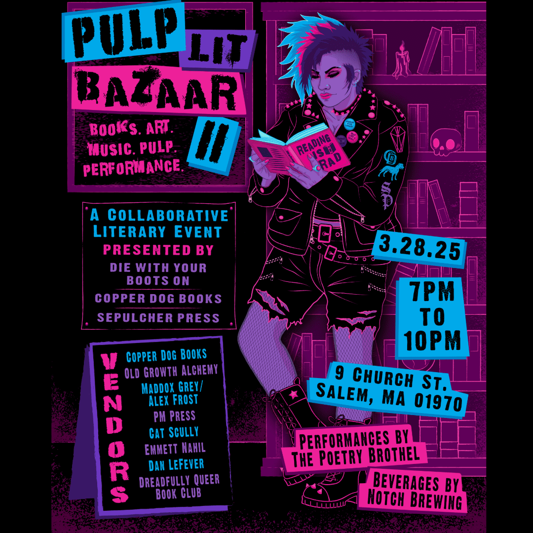 This book-centric event is part market, part stage show, part party, and 100% a killer time. FREE admission! Performances by the Poetry Brothel Beverages by Notch Brewing Vending by: Copper Dog Books Old Growth Alchemy Maddox Grey/Alex Frost PM Press Cat Scully Emmett Nahil Dan LeFever Dreadfully Queer Book Club